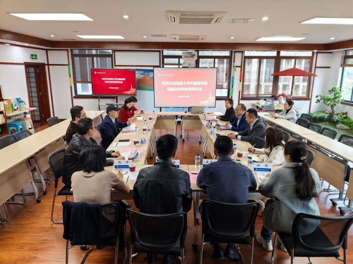 为推动基层党建高质量发展,深化党建与事业发展深度融合,3月13日上午,海南大学外国语学院与四川外国语大学多语种院系党建经验分享交流会在立德楼C417举行。全国党建工作标杆院系负责人、海南大学外国语学院党委书记覃成海、全国高校“双带头人”教师党支部书记、外国语学院原院长金山应邀开展经验分享交流。四川外国语大学日语学院、翻译学院、西方语言文化学院、东方语言文化学院的党总支书记、副书记及教工党支部书记和专职组织员参加了分享交流会。学校党委常委、副校长、日语学院党总支书记胡安江主持会议。