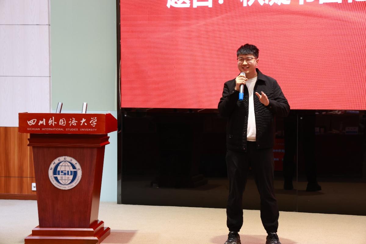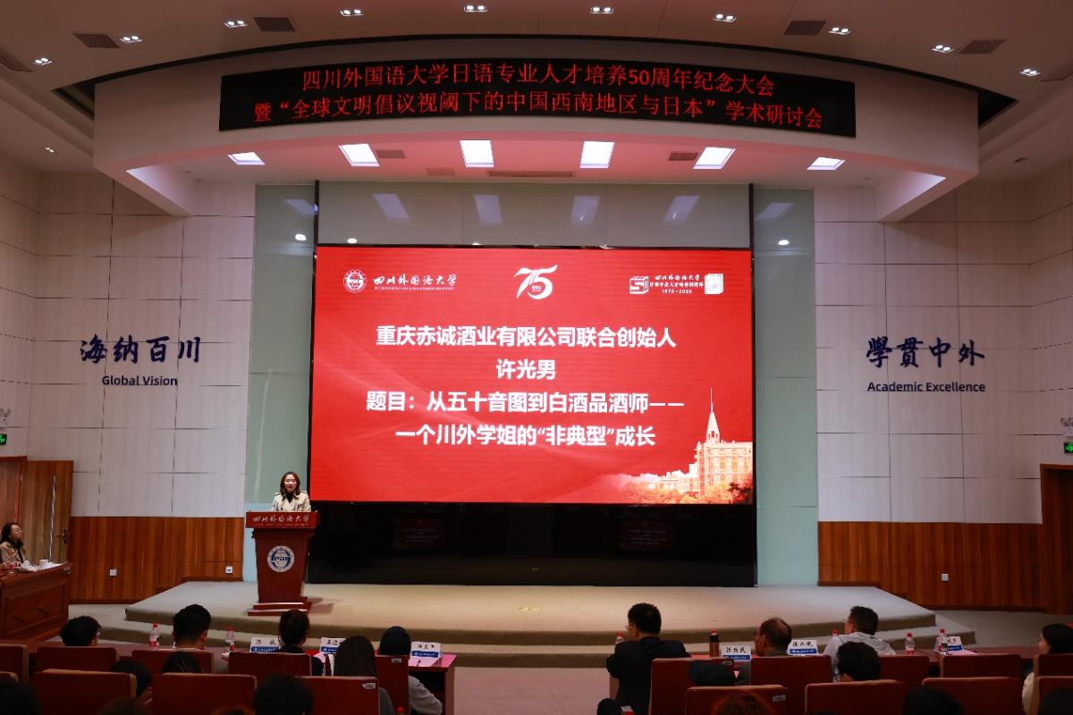 2007 级校友、重庆赤诚酒业有限公司联合创始人许光男,以《从日语五十音图到白酒品酒师 —— 一个川外学姐的 “非典型” 成长》为题,分享了自己打破偏见、跨界发展的独特经历。她从专注日语学习起步,最终成长为国家二级白酒品酒师,将 14 年的成长历程比作 “不断探索的原野” 而非 “预设轨道”。许光男为学弟学妹送上三条建议:一是重视大平台的系统价值,学习成熟的职业运作模式;二是培养沟通等可迁移能力,以其放大专业优势;三是认清成长的动态性,做到慎重选择、执着执行,在每段经历中积累扎实经验。