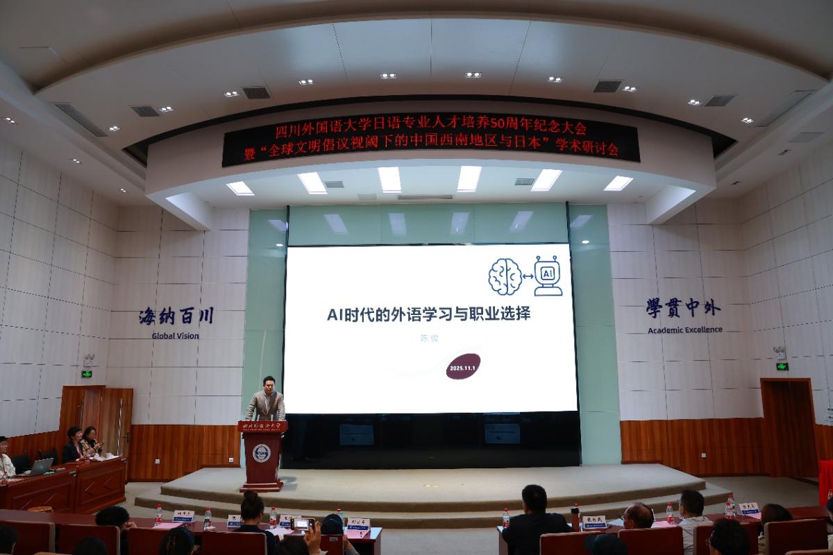 2006 级校友、青岛智田幼儿园创始人、山东女子学院教育学院教师兼太原师范学院教育学院硕士生导师陈俊,围绕《AI 时代的外语学习与职业选择》展开分享。他提出,AI 时代对人才的评价标准已从单一的知识与技能,转向性格、情感、道德、意志力等综合品质。外语学习不仅未因 AI 发展而失去价值,反而对个人人格修炼与思维重塑具有积极推动作用,能潜移默化地影响行为方式与情感特质。陈俊建议学弟学妹不必焦虑 “日语专业是否会被 AI 取代”,应将语言视为超越工具的精神载体,放宽眼界、专注内在品质的提升。