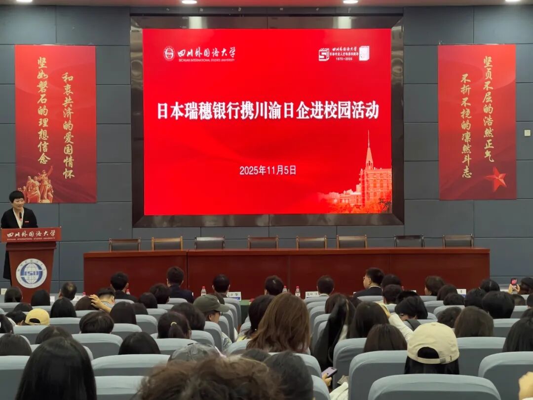 为深化校企合作,提高人才培养质量,拓宽毕业生就业渠道,作为四川外国语大学日语专业人才培养五十周年纪念活动的一环,11月5日下午,日语学院在歌乐楼A幢报告厅成功举办日本瑞穗银行携川渝日企进校园活动。日本瑞穗银行(中国)有限公司武汉分行、日东材料科技(成都)有限公司、重庆罗森便利店有限公司、重庆横河川仪有限公司的企业代表到场宣讲并与师生交流。学校党委常委、纪委书记,市监委驻四川外国语大学监察专员杨国祥,学院领导罗先明、陈可冉和近300名本科生和研究生参加活动。活动由学院合作与交流办公室主任张颖主持。